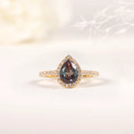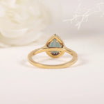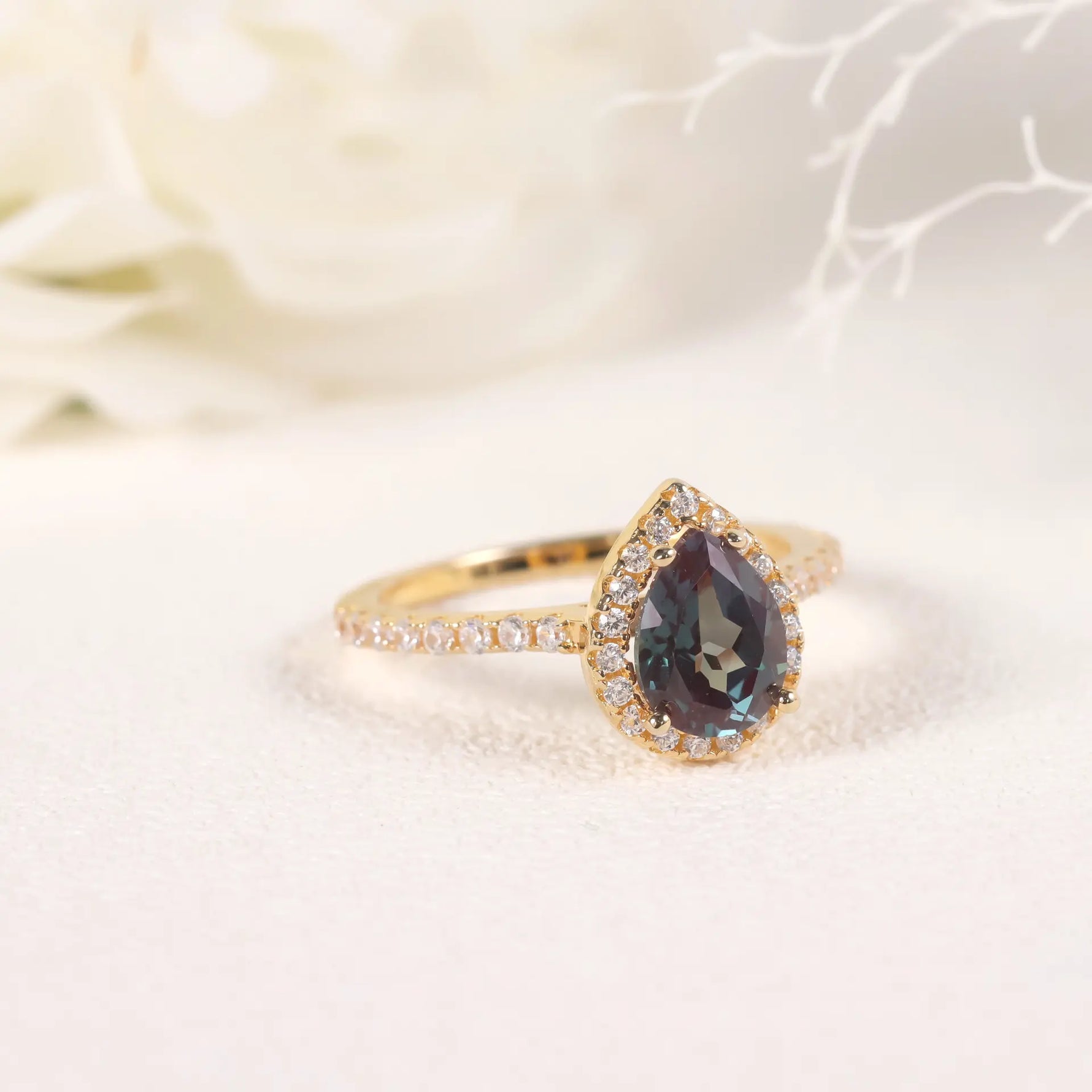 Encircled by a halo of sparkling moissanite, this pear alexandrite engagement ring reflects timeless love and evolving grace.