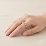 This exquisite piece features five round lavender amethyst gemstones, each 2 mm in size, perfectly complemented by six round white zircons. The ring is crafted from high-quality 925 sterling silver and plated with 10K yellow gold, offering a luxurious finish and durability.