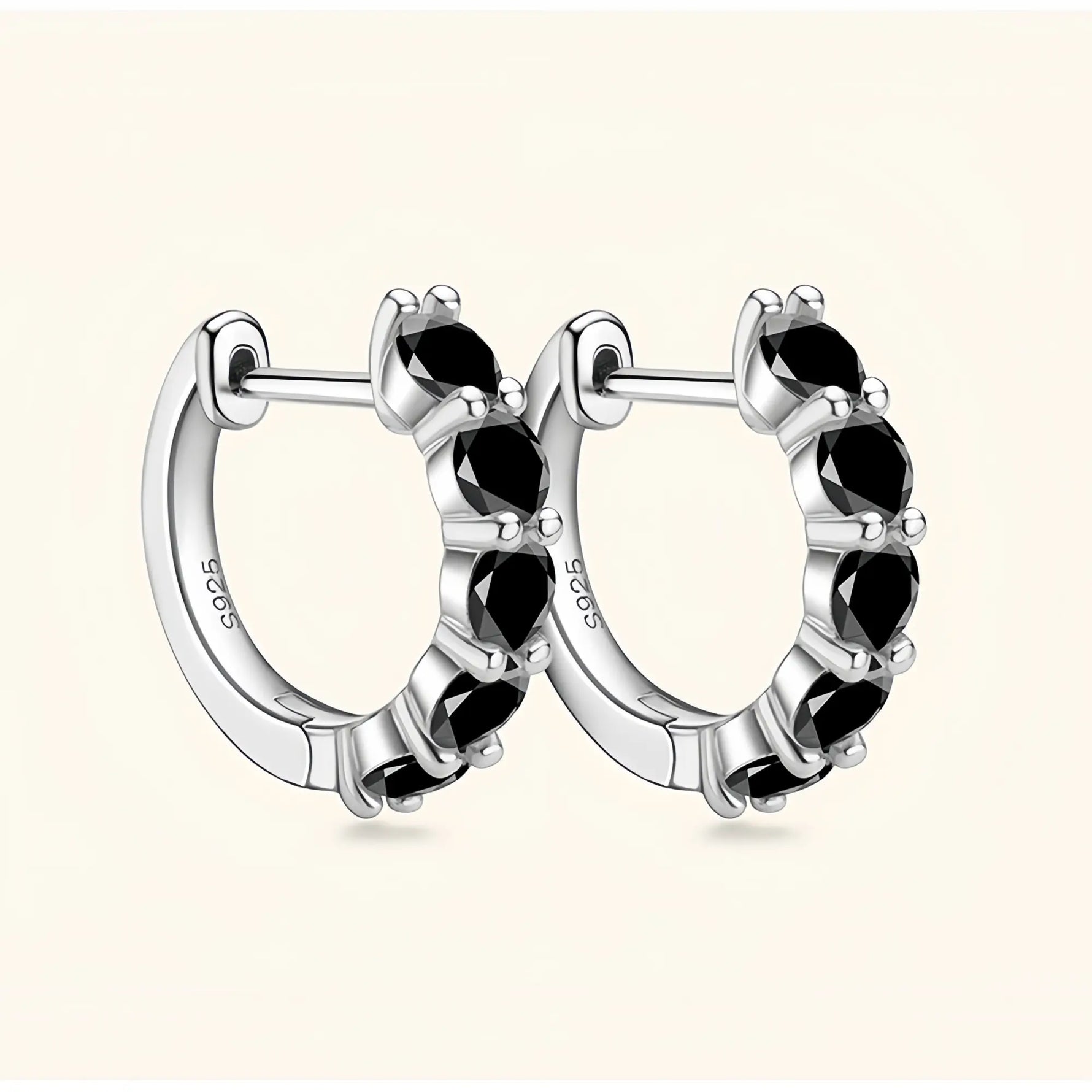 These sterling silver hoops are set with 3.5mm black moissanites, delivering a bold yet refined statement. The sleek structure and high-shine black stones evoke a powerful energy — made for women who embrace their edge, lead with poise, and glow with unapologetic strength.
