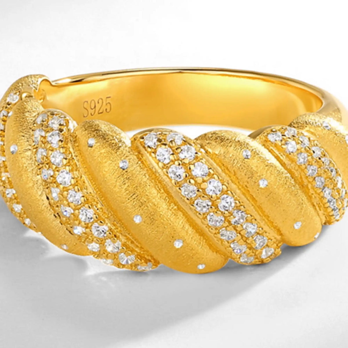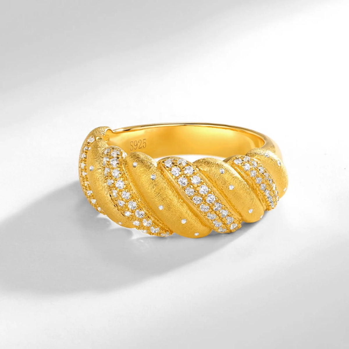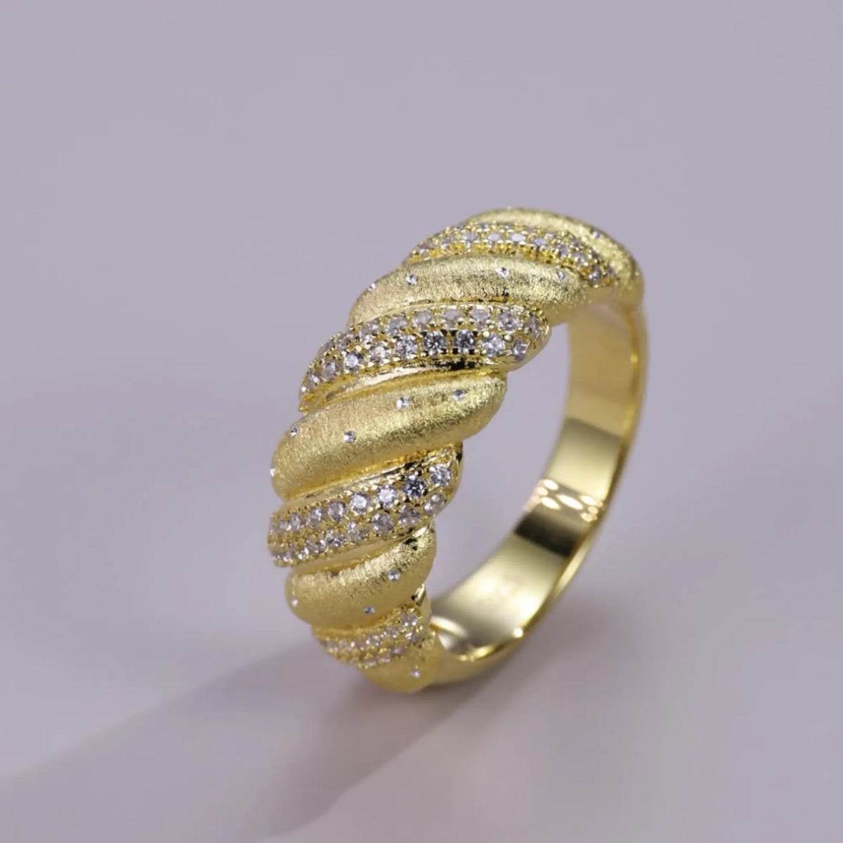 Crafted for visual rhythm and elegance, this dome-shaped ring features alternating brushed and polished curves, each set with micro-pavé white stones. The swirling design adds movement, shine, and depth—perfect for styling alone or with gemstone pieces for contrast and texture.