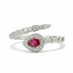 This Natural Ruby Diamond Ring showcases a vivid pear-cut ruby framed by brilliant diamonds, set in 18K white or rose gold. A symbol of love, passion, and courage, it makes a timeless choice for engagements, anniversaries, or personal milestones.