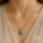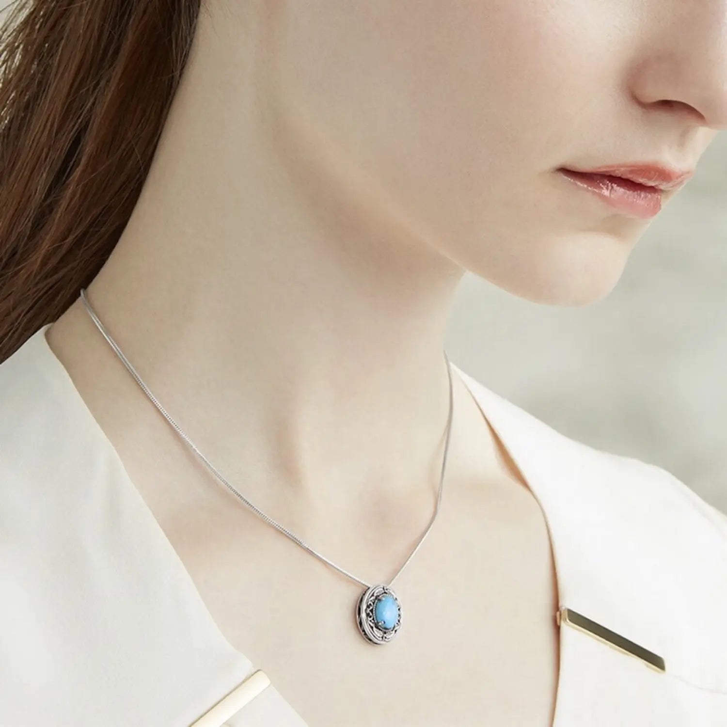 This Turquoise Pendant Gold features a 7x9mm synthetic turquoise stone, beautifully set within a detailed S925 sterling silver frame with gold plating, adding a touch of luxury and durability. The intricate design surrounding the turquoise enhances its vibrant color while creating a vintage-inspired look.