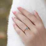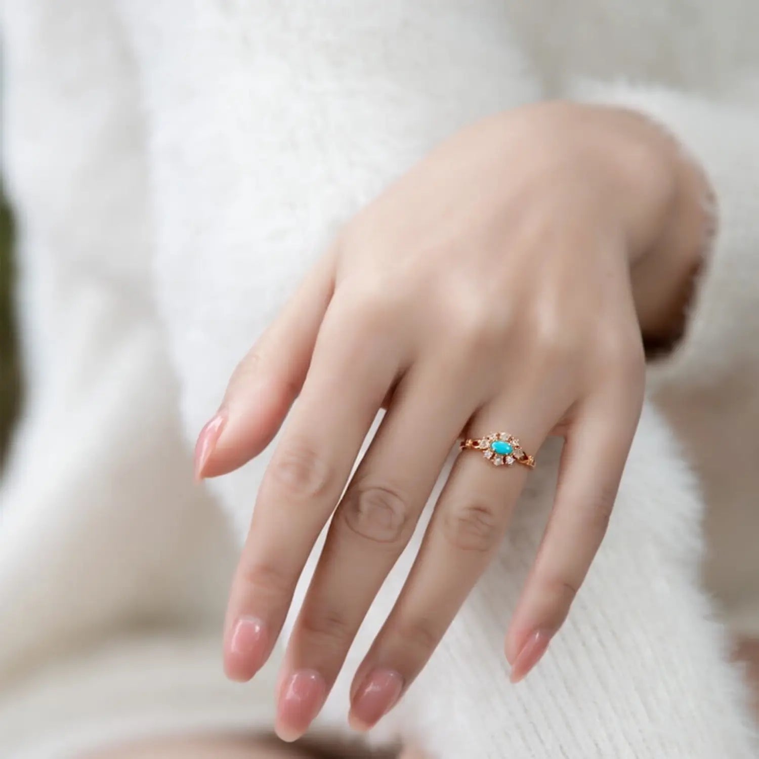 The centre stone features vibrant natural turquoise, known as a stone of protection and good fortune. Its unique blue hue is enhanced by delicate accents, creating a design that shines from every angle. Whether chosen as a turquoise engagement ring, a boho-inspired wedding piece, or simply as a blue gemstone ring full of personality, this piece is designed to resonate with your story.