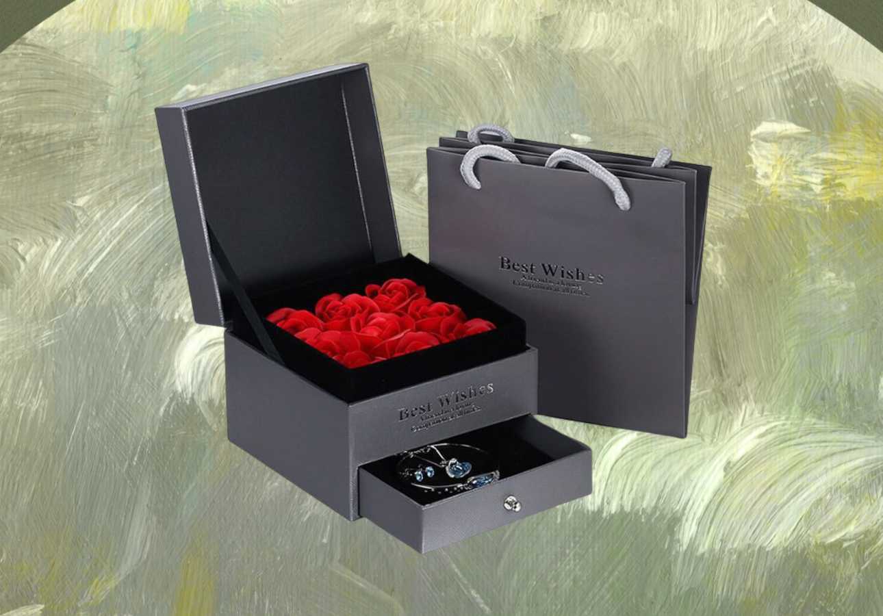 This modern black jewelry box features 9 soap roses, adding a touch of romance and luxury to your gift.